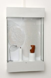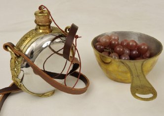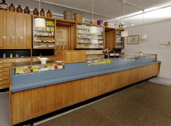 | Feldflasche und Kasserole (Nachbildungen, Ankauf: Förderverein) | Römerberg-Apotheke, Einrichtung 1960er Jahre (Podeste, Stellwände: Förderverein) |