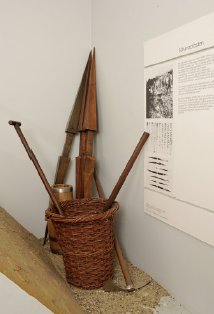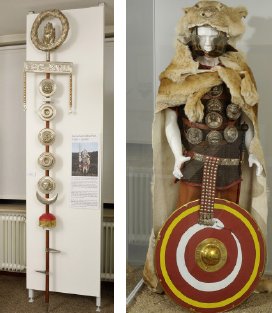 | Römisches Feldzeichen (links) und Feldzeichenträger „signifer“ (rechts) mit Löwenfell, Schild und Orden „phalerae“ (Nachbildungen) | Schanzwerkzeug eines Legionärs mit Schanzaxt „dolabra“, Schanzkorb und Schanzpfosten „pila muralia“ (Nachbildungen) |