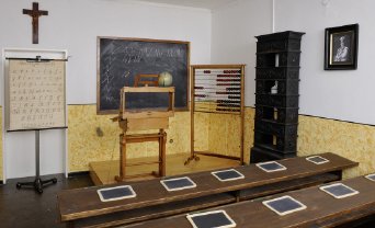 | Historisches Klassenzimmer um 1900 im Nebengebäude des Stadtmuseums; hier findet das Schulklassenangebot „Schule wie zu Kaisers Zeiten“ statt (Ausstattung: Förderverein) | Schildkrötpuppen von 1930 bis heute; Sammlung Eva Eckold-Donder, (Vitrinen: Förderverein) |