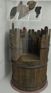 | Ring mit Gemme und Terra-sigillata-Becher (Originale, Vitrine: Förderverein) | Weinfass und Dachschindeln, Römerlager Oberaden (Vitrine: Förderverein) |